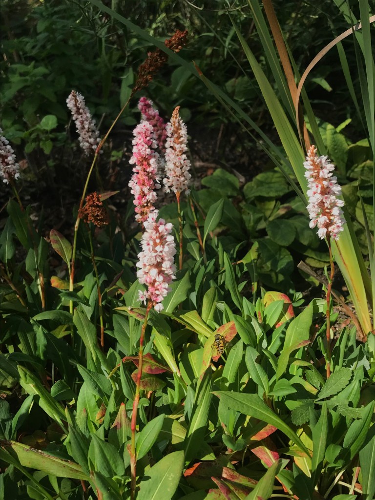 I have Persicaria amplexicaulis flowering again. The very hot, dry weather in July rather did for it so I ruthlessly cut it back and with the rain we did get and a bit from the water butt they are having a second go. Persicaria bistorta, a lower more ground hugging variety did rather better and is covered in little candle flowers ranging from pale pink, through dark pink to russet. It can be a bit thuggish but it is great ground cover and easily pulled out where you don’t want it encroaching.