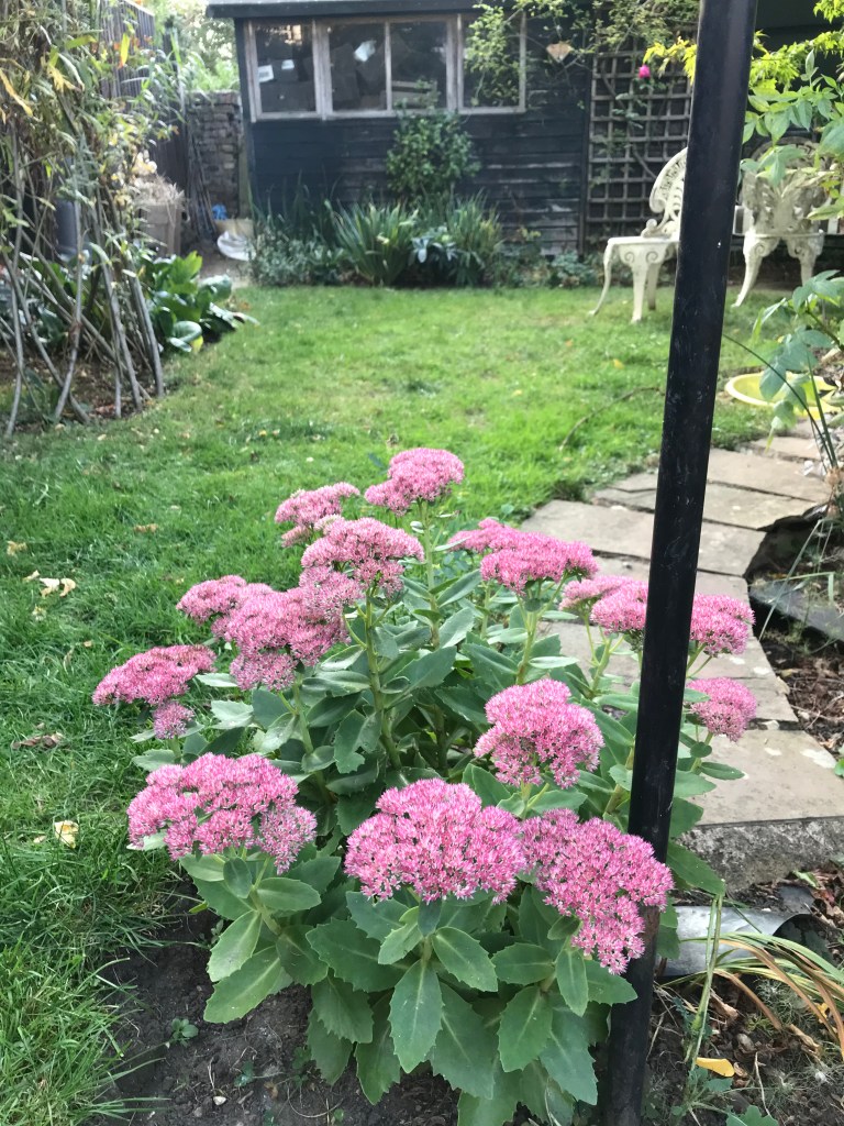 Verbena bonariensis and Crocosmia ‘Emily MacKenzie’ are at the polar opposites of the so-called colour wheel and clash in a wonderful way that only flowers can. The Verbena self seeds itself merrily but it is easy to pull out the seedlings in early summer where you don’t want them. And of course the stalwart of the Autumn garden are Sedums. I have a bog standard one which starts out a lovely pale green and then turns pink in September. You can get them in all shades of pink and if dark leaves are your thing then what about Sedum ‘Red Cauli’. I think I might have to add a few more, squeezed in somewhere where the bees can land on there flat flower heads like a helicopter landing pad.